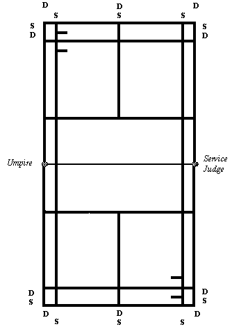1.1 The court shall be a rectangle and laid out as in the diagram (except in the case provided for in Law 1.5) and to the measurements there shown, defined by lines 1" (40 mm) wide.