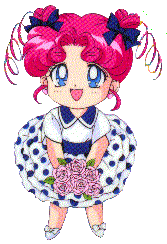 ::Huggles her doll, looking around:: Usagi-chan told me to write a profile (and Haruka-san *hinted* at it). I love being in the past with everyone here that I love, even though they underestimate me because I look so young. But in the future I'm Usagi-chan's ::flexes:: Ultimate Form!! I spend most of my time with Usa-chan and Usagi-chan, and I live with them. However, sometimes I'll spend the night with Mamo-chan. I have "issues" with the Lights, and a favorite hobby of mine is to beat them with the mighty thwacking umbrella. I also like to watch Haruka-san and Michiru-chan together (they're a beautiful couple). Last, and not leastest, is Hotaru-chan!! She's one of my best friends with Usa-chan. I fight along with them as the sailor-suited fighter of justice, Sailorchibichibimoon!! ::Sweatdrop:: Eeeeh..