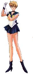 Sailor Uranus has an intimate relationship with Sailor Neptune. She usually dresses in mens' clothing like suits. She races cars and she has a sword as a weapon. |