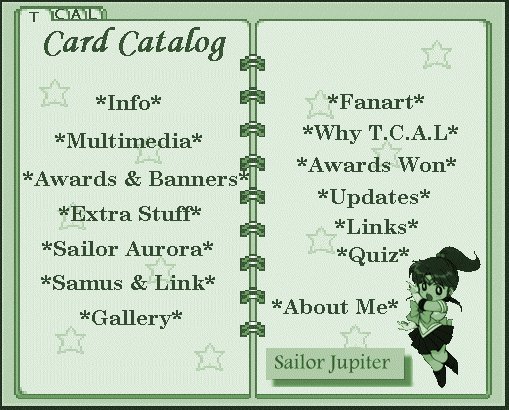 You are now in The Crystal Anime Library. In this internet anime library,you can read info and a fanfic,download some stuff,look at some fanart,get free goodies,and much more. All on Anime! In order to go to these places,click on the links in the card~catalog below. Have fun!