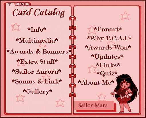You are now in The Crystal Anime Library. In this internet anime library,you can read info and a fanfic,download some stuff,look at some fanart,get free goodies,and much more. All on Anime! In order to go to these places,click on the links in the card~catalog below. Have fun!