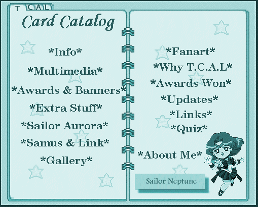 You are now in The Crystal Anime Library. In this internet anime library,you can read info and a fanfic,download some stuff,look at some fanart,get free goodies,and much more. All on Anime! In order to go to these places,click on the links in the card~catalog below. Have fun!