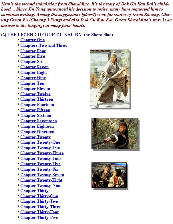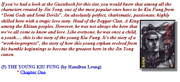 This page is dedicated to every true Jin Yong fan who is longing for the day that Jin Yong will come out of retirement and write more novels! As you and I know, that day will probably never come! So the next best thing would be to come up with stories ourselves.....