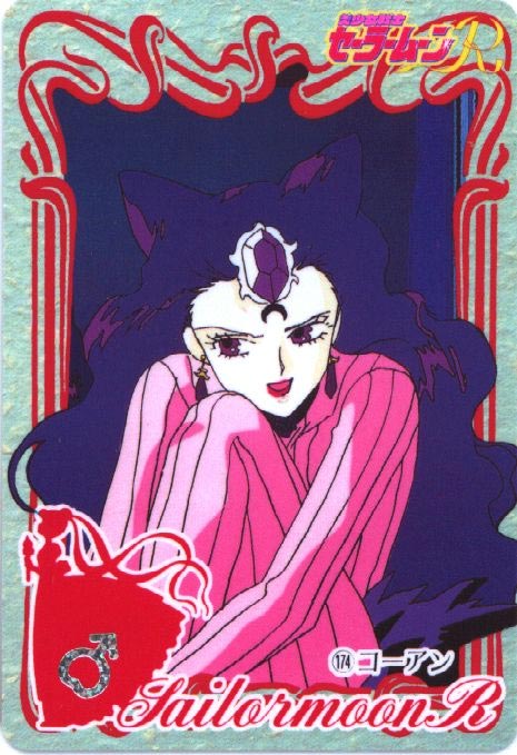 Catsy is the most vain of the Four Negamoon Sisters and rarely even physically fights with the Scouts. Normally, she'll use a whole barrage of energy attacks and will stay at a distance. She had a crush on Rubeus and he took advantage of this by using this puppy love to manipulate her. She was turned good when Rubeus had finally gotten angry at her for screwing up again and gave her a powerful energy bomb, big enough to kill everyone nearby, including herself. Sailor Mars, Rey, saw the good in her and Sailor Moon transformed her into a normal human being and they became good friends.