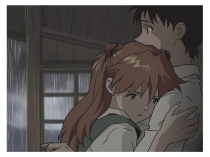 How does Shinji see Asuka? At first, Asuka is an annoyance to Shinji. She literally moves into his life, without his concent, and demands his obediance and respect, when her actions have done nothing to deserve it for many...many...episodes afterwards. However, when forced to 'sync-train' with Asuka, Shinji unknowingly starts to do something he has never done before. He tries to understand her. Eventually, Shinji gets close enough to see her at her most vulnerable moments, and realizes that they are not so different after all. Though he can never confront Asuka about his feelings, he does mention that if she wants his heart, all she has to do is be kind to him. A very honest plea from a boy who wants only for people to stop hurting him.