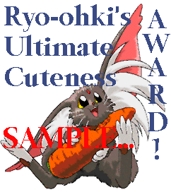 Ryo-ohki's Ultimate Cuteness Award is an award for the net's cutest anime pages. Pages that are so cute that is makes you sick! Pages that are so sweet they give you cavities. Pages so sugery and full of aweful cuteness that it's bright to look at and yet you get a headache anyway. This award is for pages that are cute only. It's hard to win because it's hard to make a page cute and informative with all the stuff you're looking for. This award goes out when ever it wants, just like The Anime Hot Shot Award. It's not a monthly prize. But still, it is a great honor. Many pages strive for cuteness, but only Ryo-ohki, knows the cutest. Good luck, to all of you. May the cutest page win!