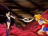 Sailor Uranus rushed to the prayer hall, where Neptune was bound to a block. Uranus ran across a bridge, but tiny arrows starting hitting Uranus at all sides. Eudial told Uranus that she would take the second talisman first, the one in Uranus. Uranus was surprised because she didn't think she had a very pure heart. Eudial was about to shoot Uranus with her gun.