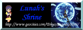 Konnichiwa minna. I'm Lunah (aka. Nocturnal Miyu and many other names that I don't use as often...). If you are wondering who "Lunah" is, well she is a character from the RPG game on Sega CD (I know it's old), "Lunar: The Silver Star." It has nothing to do with Anime, but I think she's pretty cool. Well, my page started out as just an Anime Picture Gallery, but it's grown since then... Well, this page may contain some spoilers, but not much, since I don't know much about some of the Anime myself. :p Oh yeah, my Lunar Page, Vampire Princess Miyu Page, and my Music Gallery are independent of this page, so if you want to know of updates in those pages, you must visit them. You won't find anything out from this page. Other than that, all my updates on my other pages are posted under my updates.